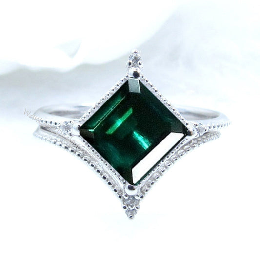 Set di anelli di fidanzamento NSEW con smeraldo e diamante Milgrain Princess Kite, fede nuziale V Chevron, personalizzato, oro rosa giallo bianco 14k 18k, platino