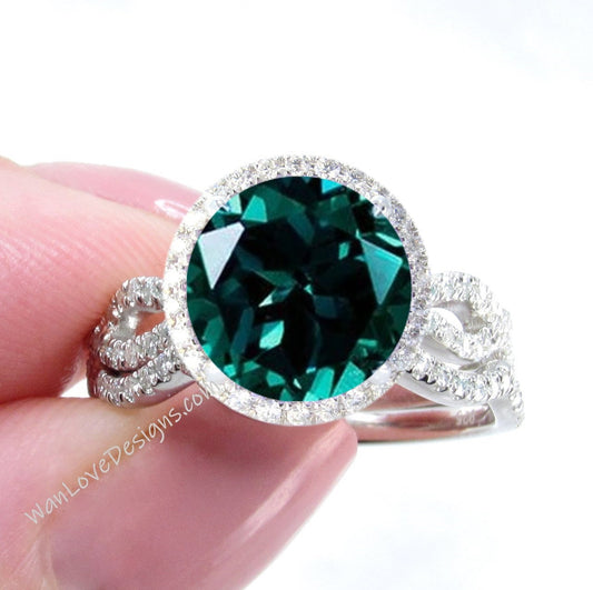 Anello di fidanzamento Halo rotondo con smeraldo e diamante infinito con gambo diviso, fede nuziale annidata personalizzata 14k 18k bianco giallo oro rosa platino