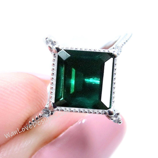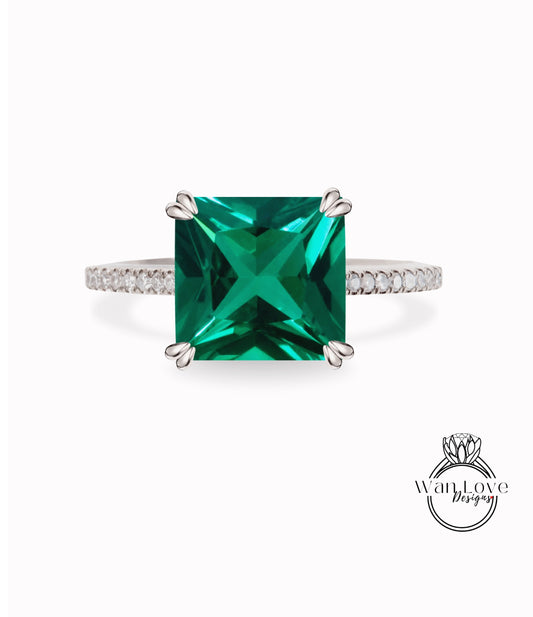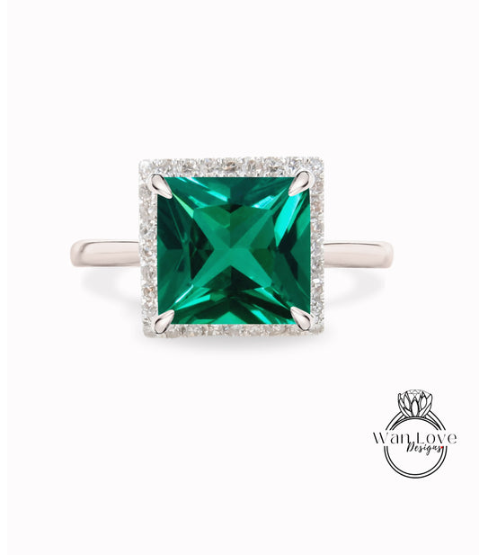Anello di fidanzamento con smeraldo e diamante Princess Halo, cattedrale quadrata, personalizzato in oro 14kt 18kt, platino, anniversario di matrimonio, WanLoveDesigns