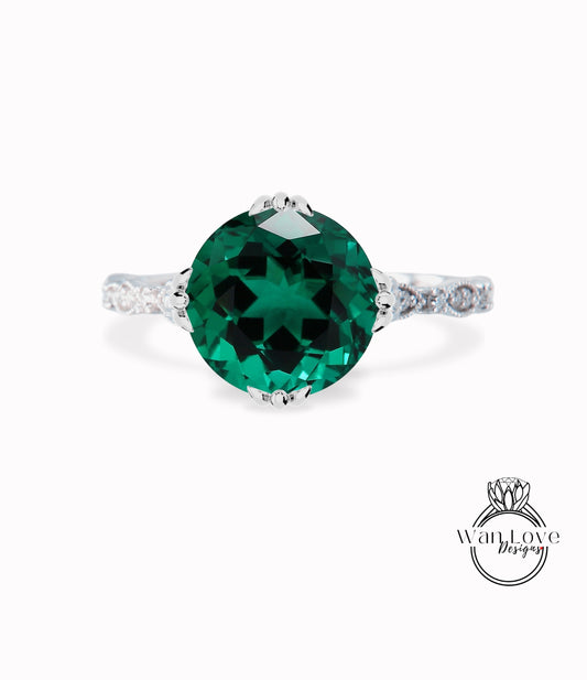 Anello di fidanzamento rotondo con punta a tripla coda di pesce smerlato antico Milgrain con smeraldo e diamante, matrimonio personalizzato-14kt oro 18kt-platino, anniversario