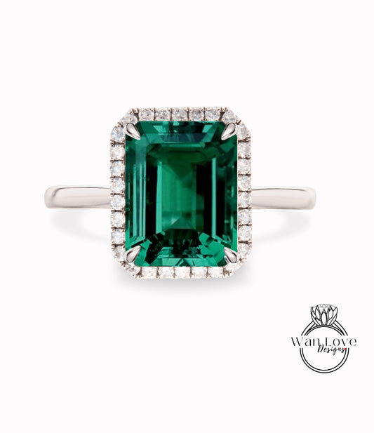 Anello di fidanzamento Halo con smeraldo e diamante, gambo liscio, personalizzato, oro giallo rosa bianco 14k 18k, platino, regalo di anniversario, WanLoveDesigns