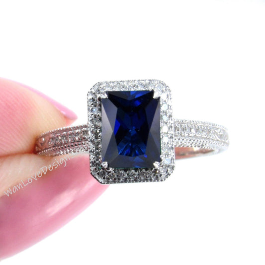 Smeraldo e zaffiro blu Halo Anello di fidanzamento Regalo di anniversario di matrimonio 10k 14k 18k Oro Platino Personalizzato