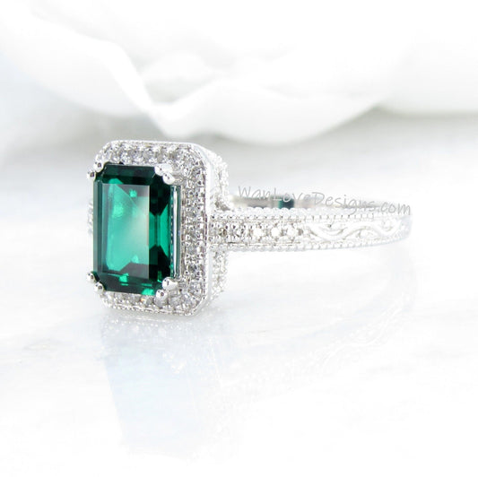 Anello di fidanzamento con smeraldi antichi in filigrana e diamanti Halo - 2ct-8x6mm-14k 18k bianco giallo oro rosa-platino-anniversario di matrimonio