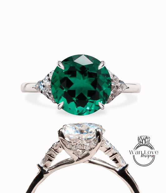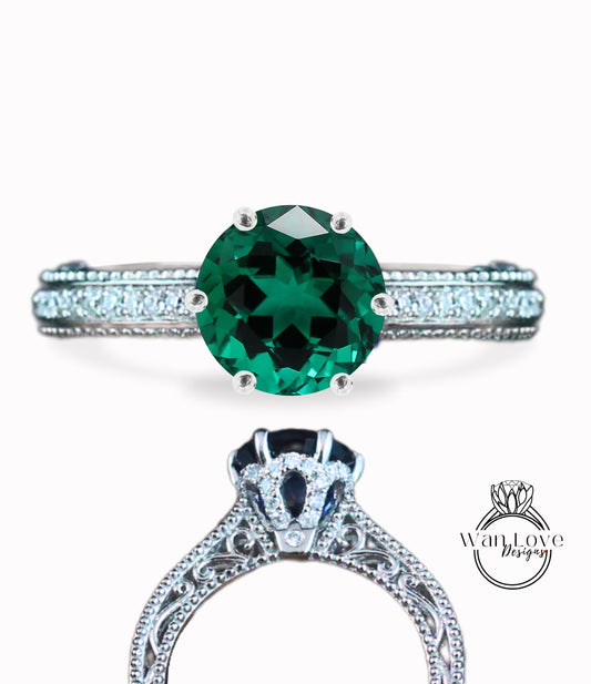 Anello di fidanzamento con foglia Milgrain con smeraldi e diamanti rotondo, 14k 18k bianco giallo oro rosa-platino-anniversario di matrimonio personalizzato, WanLoveDesigns