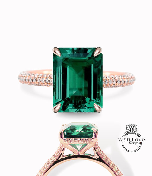 Anello di fidanzamento con smeraldo, anello con alone di diamanti, taglio a cuscino in oro rosa, con diamante moissanite, anello con gambo diviso, anello art deco, anello anniversario, regalo