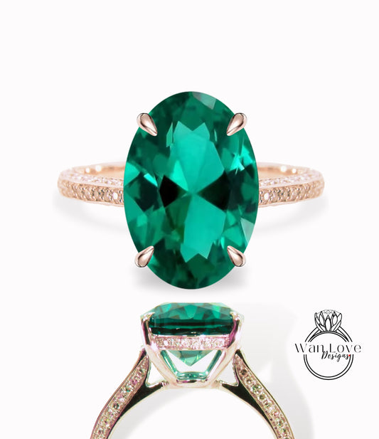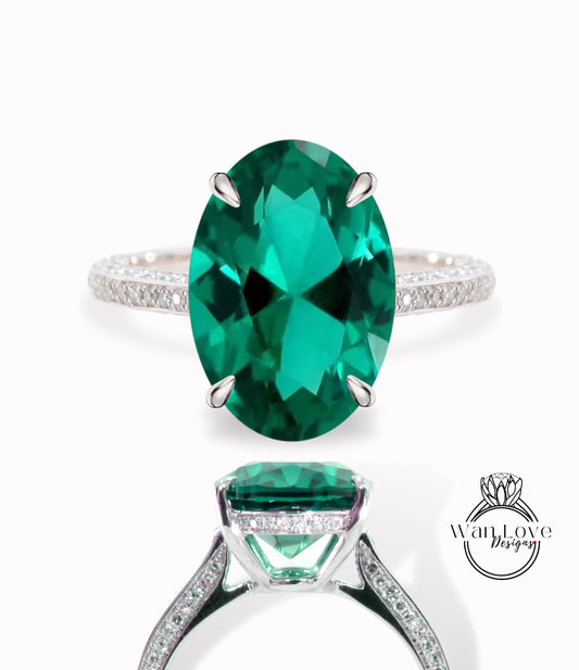 Anello di fidanzamento Halo ovale graduato con smeraldi e diamanti, personalizzato, matrimonio, 14k 18k bianco rosa oro giallo, platino, WanLoveDesigns