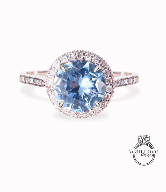 Anello d'oro con diamante Halo / Anello centrale rotondo con spinello blu acquamarina / Anello di fidanzamento / Anello anniversario / Anello di promessa / Anello Halo Milgrain