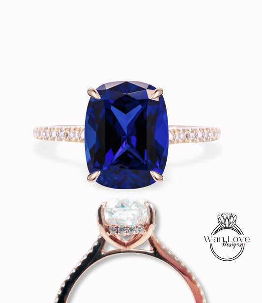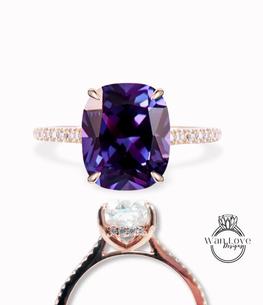 Anello di fidanzamento vintage allungato taglio cuscino zaffiro viola colore alessandrite anello alone nascosto fascia in oro rosa promessa nuziale anniversario