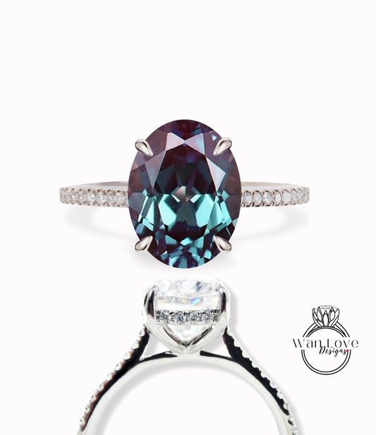 Alessandrite e diamante lato Halo ovale anello di fidanzamento con punte a cesto, 14k,18k, bianco, giallo, oro rosa, platino, personalizzato, matrimonio