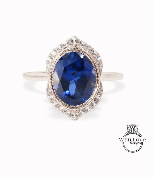 Zaffiro blu e diamante Art Deco unico lunetta ovale Halo CON o senza anello di fidanzamento Milgrain, personalizzato, oro rosa 14k 18k, WanLoveDesigns