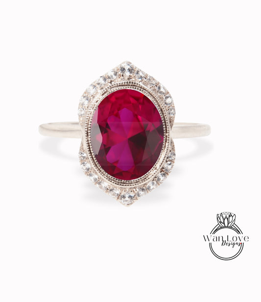 Rubino e diamante Art Déco unico lunetta ovale Halo CON o senza anello di fidanzamento Milgrain, personalizzato, oro rosa 14k 18k, WanLoveDesigns