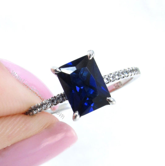 Anello di fidanzamento con zaffiro blu e bianco con taglio smeraldo da 2 ct Half Eternity, anello di fidanzamento delicato e sottile ispirato agli anni '20, anello pronto per la spedizione