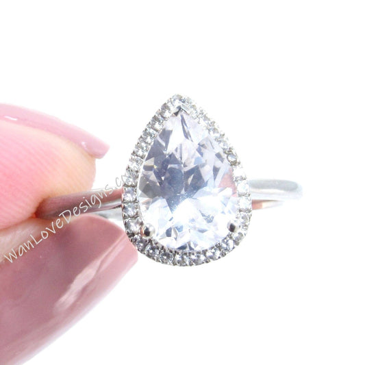 Anello di fidanzamento con zaffiro bianco Halo tagliato a pera, delicato anello con zaffiro pera, 2 ct, anello cattedrale con zaffiro pera, promessa nuziale, anello di nozze per lei