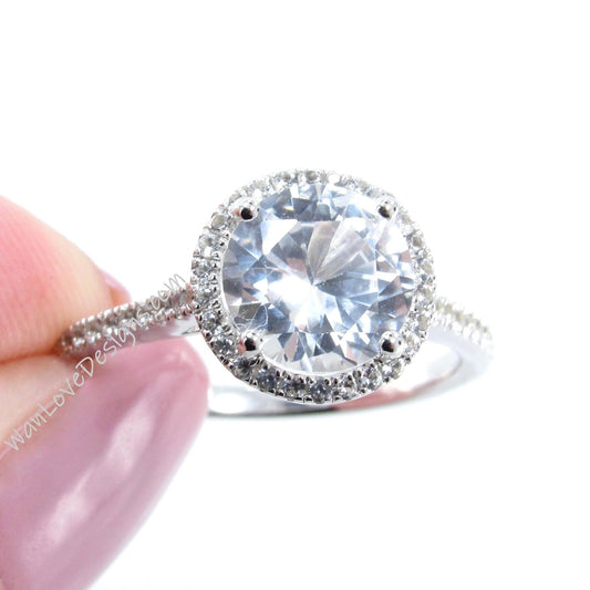 Anello di fidanzamento Halo rotondo con zaffiro bianco, 2 ct, 8 mm, argento 925 con rodio, matrimonio, regalo di anniversario, cestino, 2 carati, pronto per la spedizione