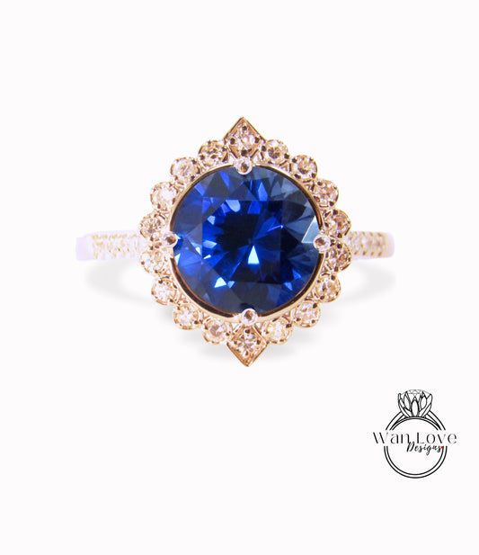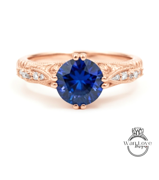Anello di fidanzamento rotondo con incisione antica con zaffiro blu e diamante, personalizzato-14k 18k bianco giallo oro rosa-platino-anniversario di matrimonio