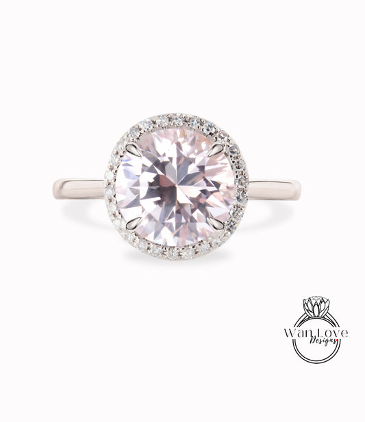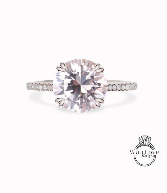 Anello di fidanzamento con zaffiro rosa chiaro e diamante, rotondo, gambo sottile, cestino, personalizzato, 14k 18k bianco giallo oro rosa platino, matrimonio, regalo