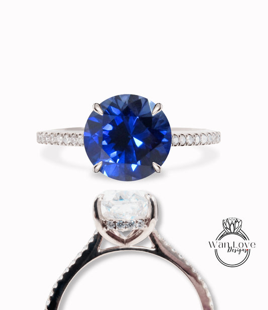 Anello di fidanzamento rotondo con zaffiro blu e diamanti, anello di fidanzamento rotondo, alone laterale, nascosto, 3/4 quasi eternità, personalizzato, matrimonio, anniversario