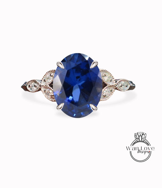 Anello di fidanzamento a grappolo antico con foglia ovale con diamante blu zaffiro Milgrain o liscio 14kt 18kt oro platino anniversario di matrimonio personalizzato