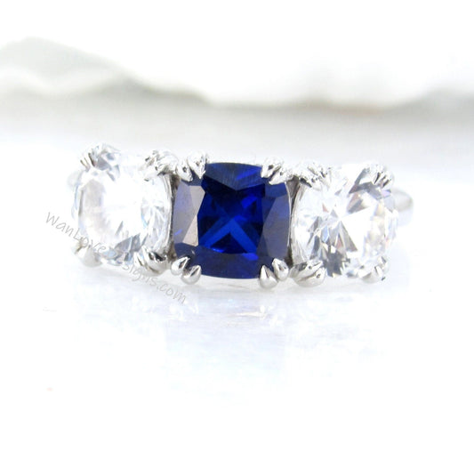 Cuscino con zaffiro bianco e anello di fidanzamento rotondo con 3 pietre-3ct-.75ct-8mm-5mm-14k-18k-bianco giallo oro rosa-platino-anniversario di matrimonio personalizzato
