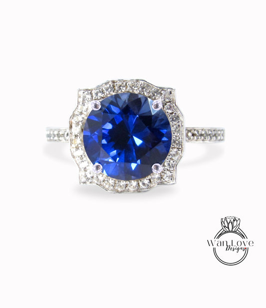 Zaffiro blu e diamante antico lunetta cornice anello di fidanzamento cestino vintage rotondo 14k 18k bianco giallo oro rosa anniversario di matrimonio