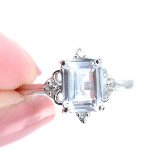 Anello di fidanzamento con zaffiro bianco tagliato a taglio smeraldo, anello in oro bianco vintage ornato in stile art deco, promette un regalo unico per l'anniversario dell'anello nuziale
