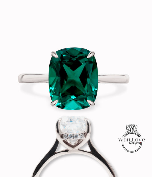 Anello di fidanzamento con smeraldo allungato taglio cuscino art deco, anello in oro rosa con diamante nascosto, anello con alone laterale, promessa di anniversario, anello nuziale