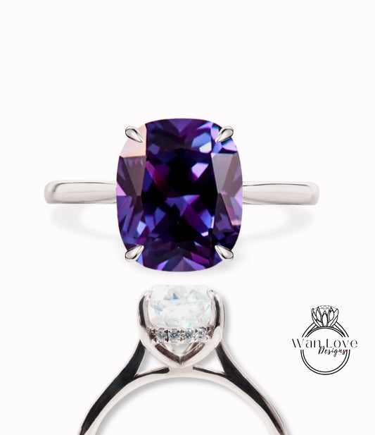 Anello di fidanzamento vintage allungato taglio cuscino zaffiro viola colore alessandrite anello alone nascosto fascia in oro rosa promessa nuziale anniversario