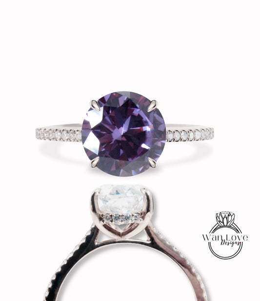 Anello di fidanzamento rotondo con zaffiro blu e diamanti, anello di fidanzamento rotondo, alone laterale, nascosto, 3/4 quasi eternità, personalizzato, matrimonio, anniversario