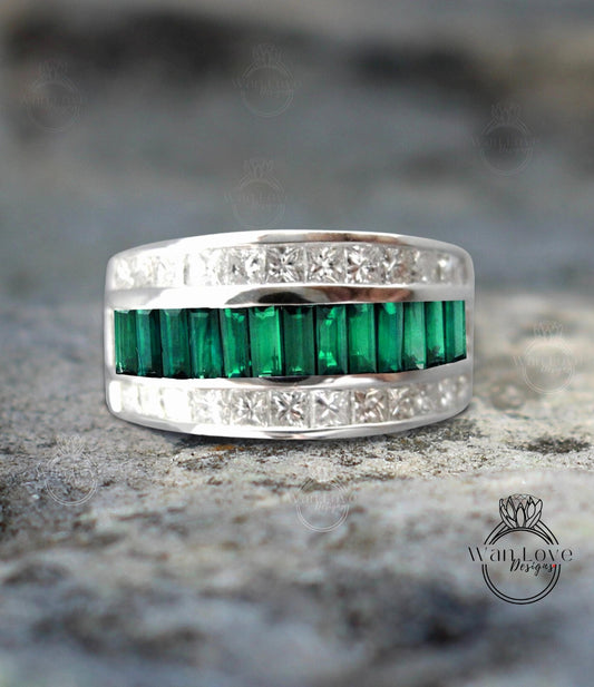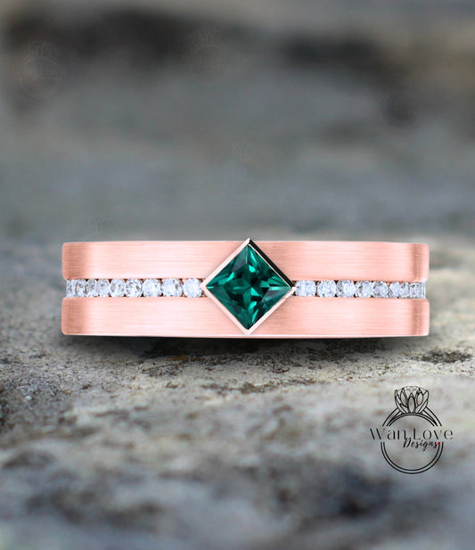 Fede nuziale da uomo con diamanti smeraldo | Fascia verde smeraldo taglio principessa | Anello da uomo in oro massiccio | Anello portafortuna da uomo con pietra portafortuna verde smeraldo taglio principessa