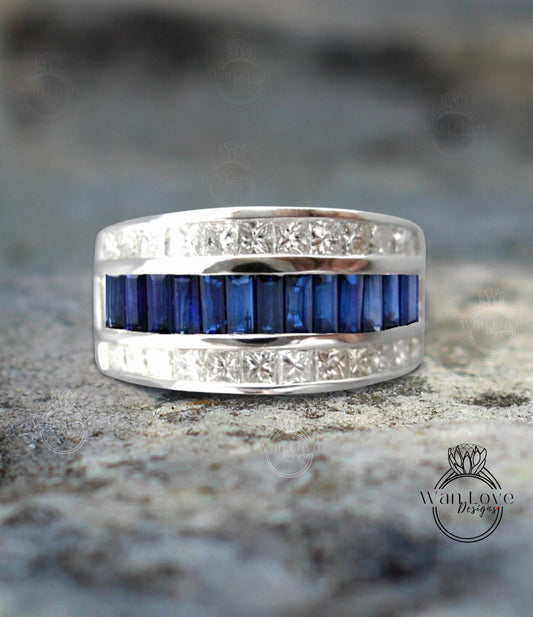 Fede nuziale da uomo con taglio principessa in zaffiro blu da uomo, fede nuziale in oro massiccio 10/14k/18k, fede nuziale Moissanite, fede nuziale