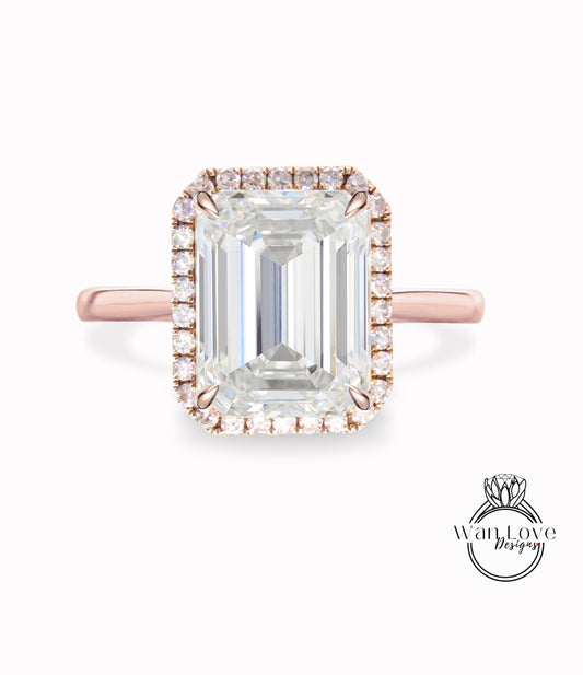 Emerald cut Moissanite engagement ring rose gold halo ring diamond halo tapered plain thin dainty band art deco anniversary promise ring