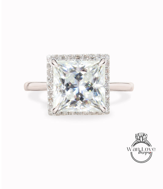 Anello di fidanzamento con diamanti Princess Halo Moissanite Anello nuziale quadrato art deco con gambo semplice, anello nuziale con promessa di diamante taglio principessa