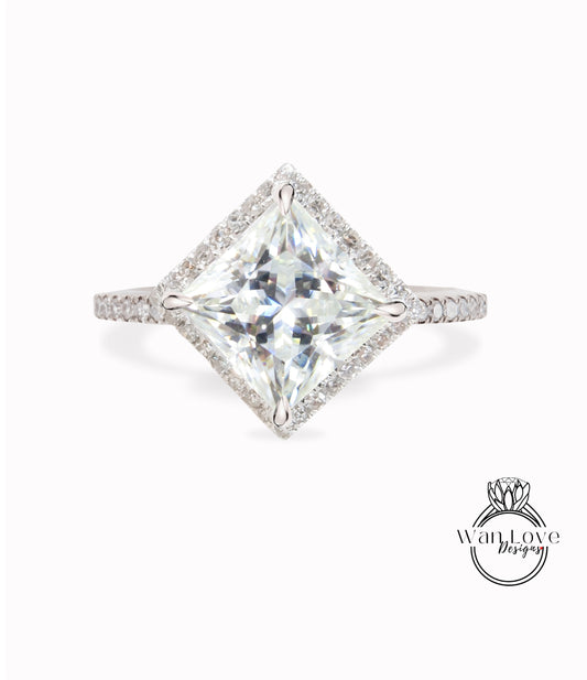 Kite set Princess Diamond halo Ring, Moissanite Diamond Princess cut Ring, Geometric Square Engagement Ring, Kite Halo Moissanite Ring