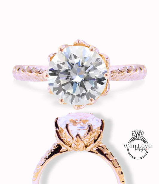 Moissanite Anello di fidanzamento a taglio rotondo Anello di fidanzamento vintage con fiore di loto Anello rotondo con foglia naturale per donna Anello nuziale unico Regalo di anniversario
