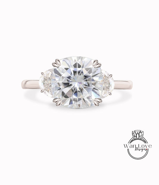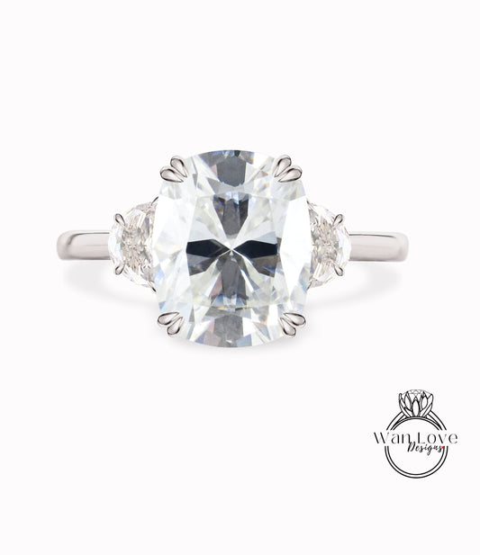 Moissanite & Diamonds Elongated Cushion Half Moon Engagement Ring Oval 3 Gem Stone diamond band ring 14k 18k White Yellow Rose Gold,Platinum,Custom wedding Anniversary Gift