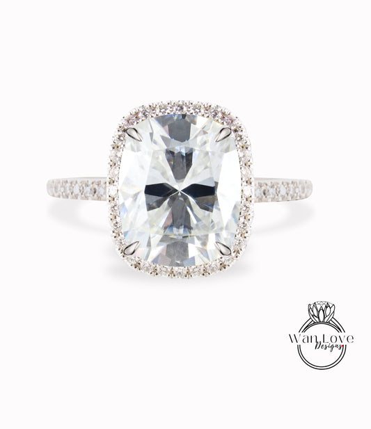 Moissanite & Diamond Elongated Long Cushion Triple Halo Engagement Ring 3 Gem Stone Trapezoid Moissanite Diamond 14k 18k Rose White Yellow gold Platinum Anniversary Gift