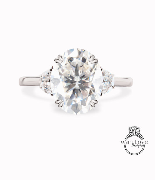 Moissanite & Diamonds Oval Half Moon Engagement Ring 3 Gem Stone diamond band ring 14k 18k White Yellow Rose Gold,Platinum,Custom wedding Anniversary Gift