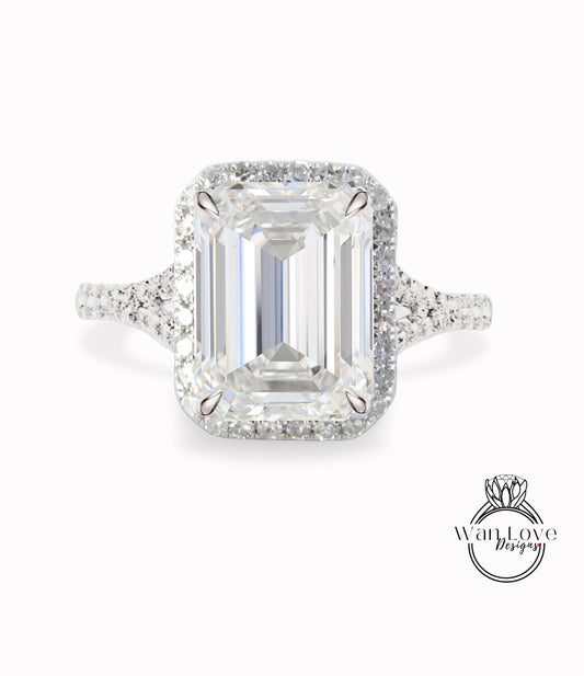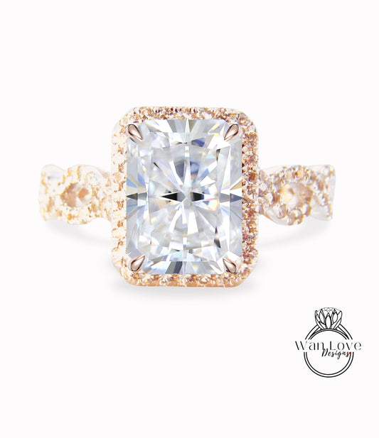 Anello di fidanzamento unico con diamante Moissanite radiante, vite attorcigliata, smeraldo, Halo, WanLoveDesigns