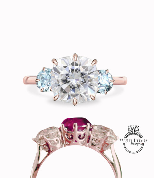 Anello di fidanzamento moissanite, anello con tre pietre, anello in oro massiccio OMC, vecchio anello tagliato in miniera, anello OEC vintage, anello art deco, anello con zaffiro moissanite.