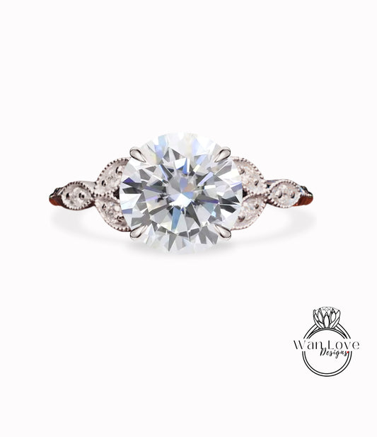 Anello di fidanzamento con diamante Moissanite a foglia a taglio rotondo Anello nuziale Milgrain a foglia antica naturale Anello in stile vintage Anello antico da sposa