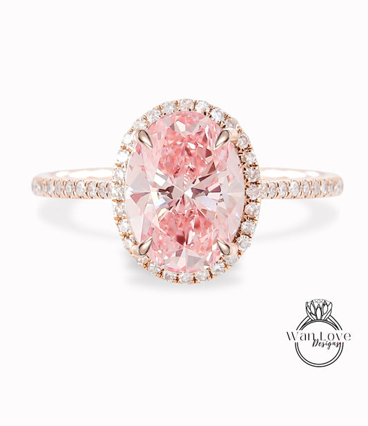 Anello di fidanzamento con zaffiro rosa chiaro ovale Halo, Anello di fidanzamento Halo Moissanite, Anello floreale a grappolo ovale in oro rosa, Anello con diamante anniversario
