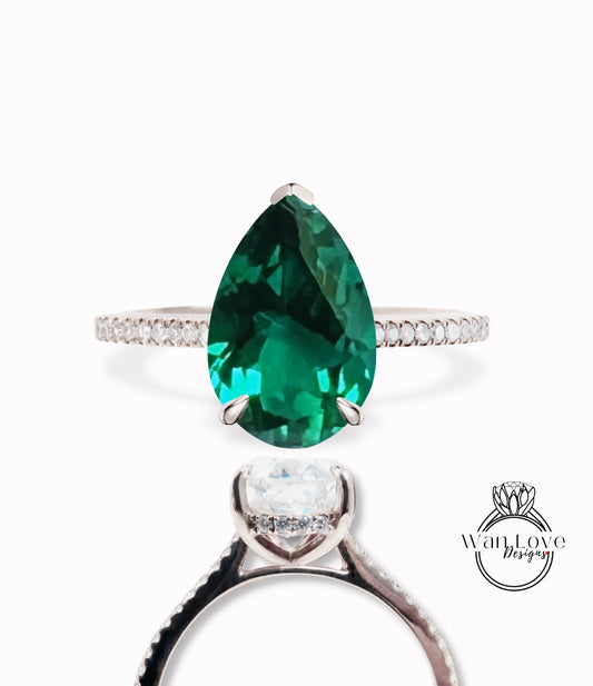 Anello di fidanzamento con smeraldo e diamante, pera laterale, cattedrale di cesto, oro 14k 18k, platino, anniversario di matrimonio su misura, WanLoveDesigns