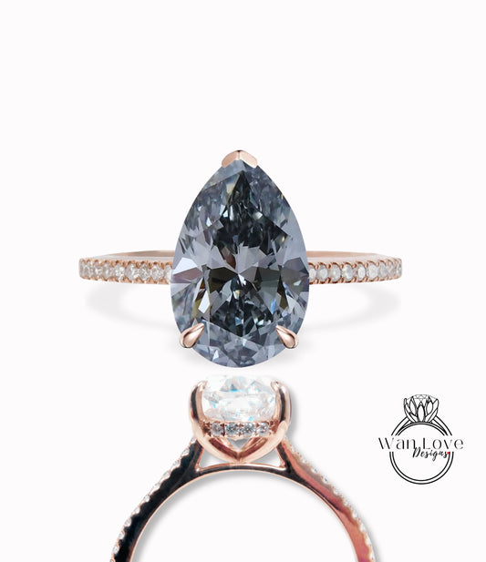 Anello di fidanzamento con moissanite grigia e diamante pera laterale Halo, taglio a goccia, cattedrale di cesto, personalizzato, oro 14kt 18kt, platino, WanLoveDesigns