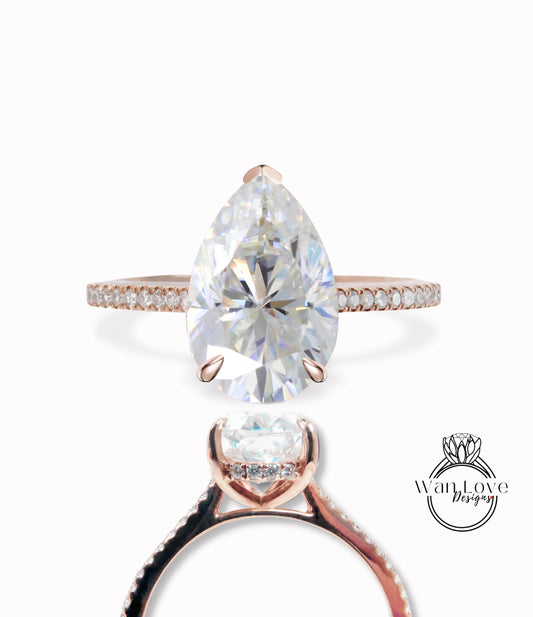 Anello di fidanzamento con Moissanite e diamante Pera Side Halo, Goccia, Cattedrale o Cestino, Matrimonio in oro-platino personalizzato-14kt 18kt, WanLoveDesigns
