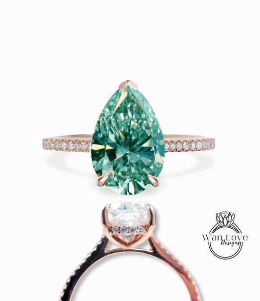 Anello di fidanzamento con Moissanite blu e diamante pera laterale Halo, goccia, cesto della cattedrale, matrimonio personalizzato in oro-platino 14kt 18kt, WanLoveDesigns