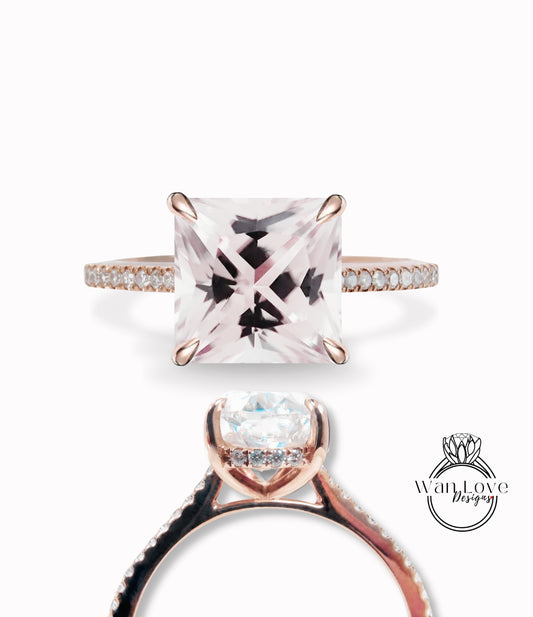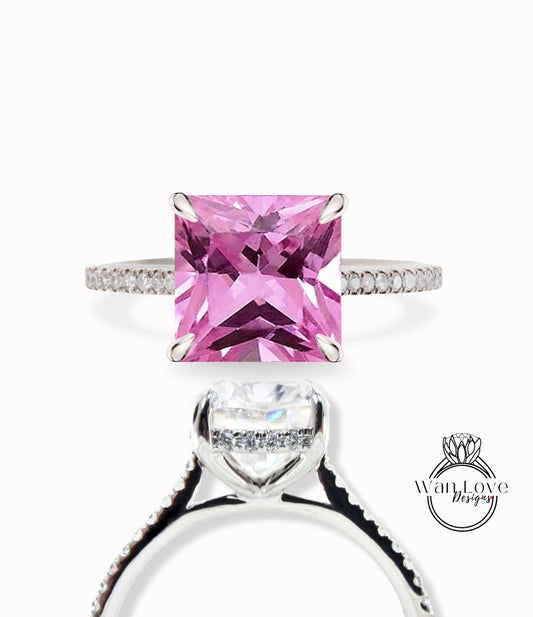 Anello di fidanzamento Princess Side Halo con zaffiro rosa chiaro e diamanti, taglio quadrato, matrimonio, oro 14kt 18kt, platino, Asscher, WanLoveDesign