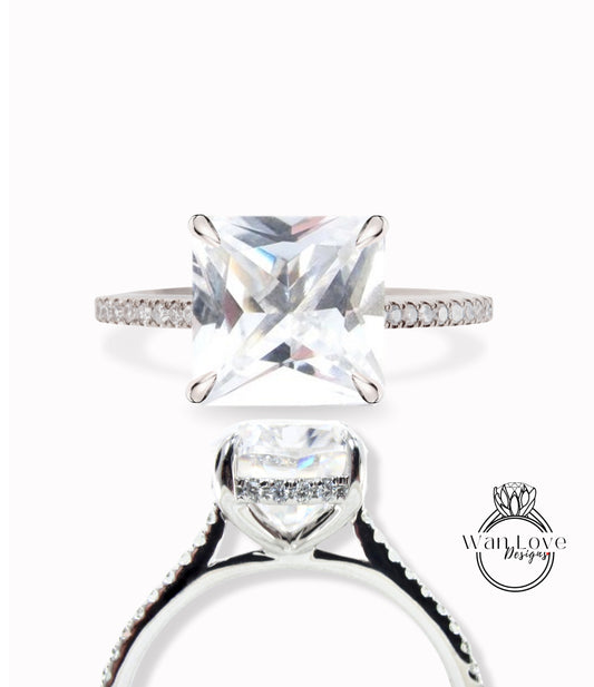 Anello di fidanzamento Princess Side Halo con zaffiro bianco e diamanti, taglio quadrato, matrimonio, oro 14kt 18kt, platino, Asscher, WanLoveDesigns