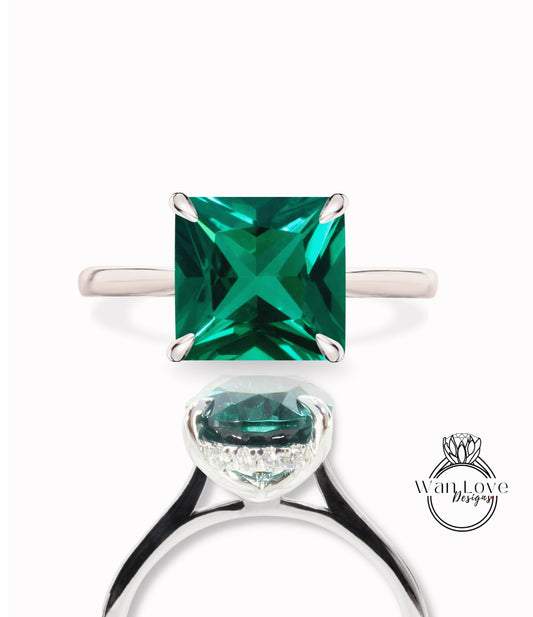 Anello di fidanzamento con smeraldo e diamante Princess Halo laterale, cestino quadrato da cattedrale, personalizzato in oro 14kt 18kt, platino, anniversario di matrimonio, platino