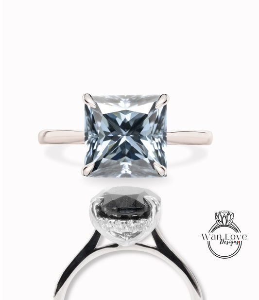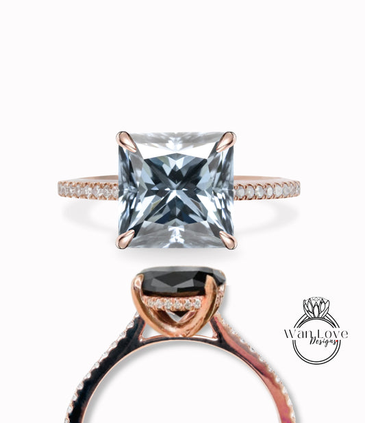 Anello di fidanzamento con Moissanite grigia e diamante Princess Side Halo, quadrato, matrimonio, personalizzato, oro 14kt 18kt, platino, WanLoveDesigns