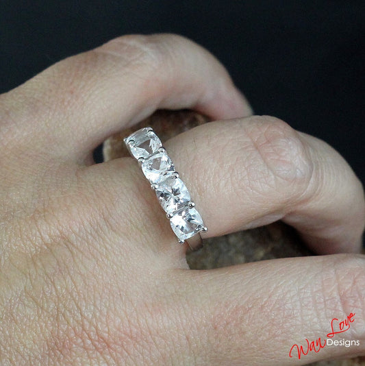 Fede nuziale vintage in zaffiro bianco Zaffiro taglio cuscino Art deco Anello a punta unico Anello nuziale mezza eternità Anello di promessa di anniversario